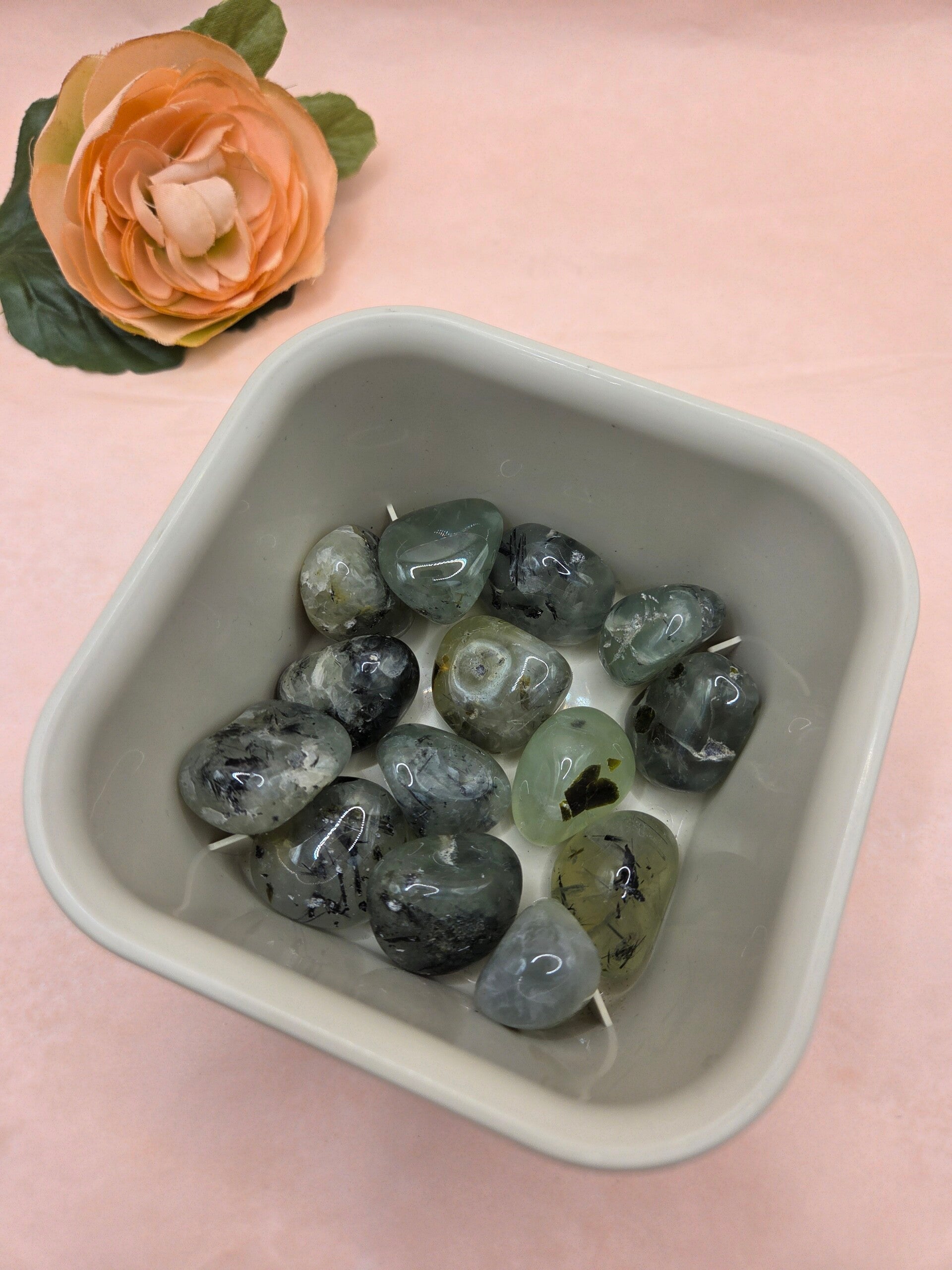 De Prehniet trommelsteen (gemiddeld 2 tot 2.5 cm) is een lichtgroene edelsteen met subtiele zwarte insluitsels, afkomstig uit India. Deze bijzondere steen wordt vaak gewaardeerd om zijn zachte en kalmerende uitstraling, die rust brengt in het dagelijks leven.