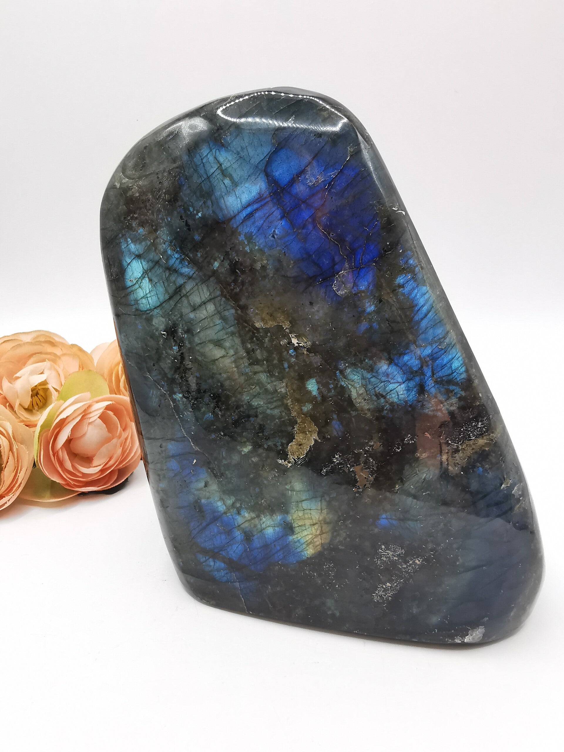 Deze Labradoriet sculptuur uit Madagaskar is niet alleen een prachtige, zeer decoratieve toevoeging aan elk interieur, maar biedt ook diepgaande spirituele en beschermende eigenschappen.