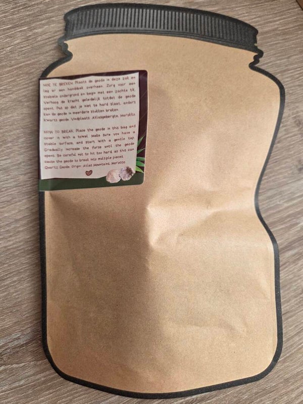 - Plaats de geode in deze zak en leg er een handdoek overheen. Zorg voor een stabiele ondergrond en begin met een zachte tik. Verhoog de kracht geleidelijk totdat de geode opent. Pas op dat je niet te hard slaat, anders kan de geode in meerdere stukken breken.