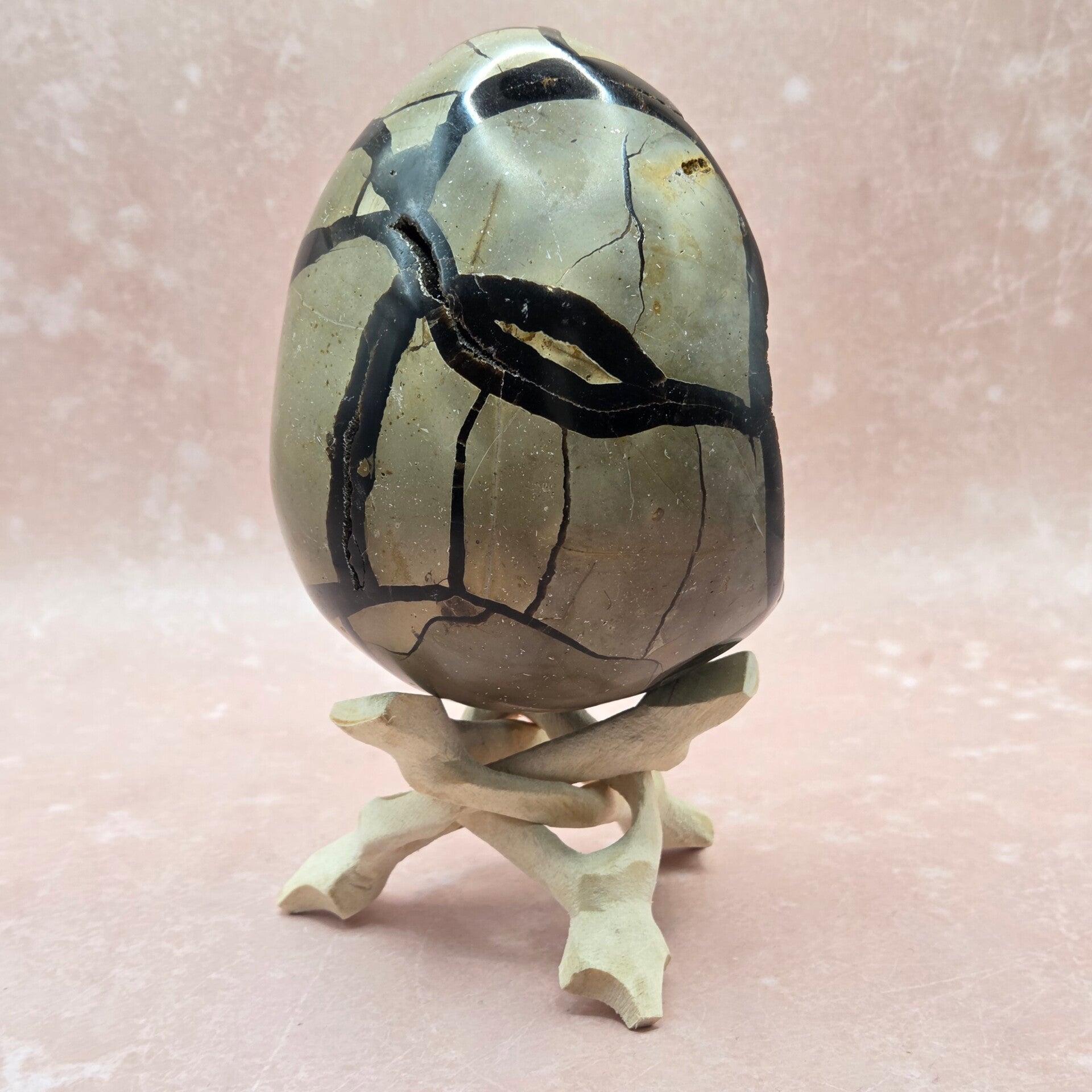 Het Septarie ei van 12.3 cm en 1433 gram komt rechtstreeks uit Madagaskar. Septarie ontstaat wanneer stukjes klei in kalkhoudende modder aan elkaar plakken. Tijdens het opdrogen ontstaan krimpscheuren die zich vullen met ander materiaal, meestal Aragoniet of gele Calciet. Deze unieke krimpscheuren zorgen voor de kenmerkende, verschillend gekleurde vakken van de Madagaskar Septarie. Elk ei is hierdoor een uniek natuurkunstwerk.