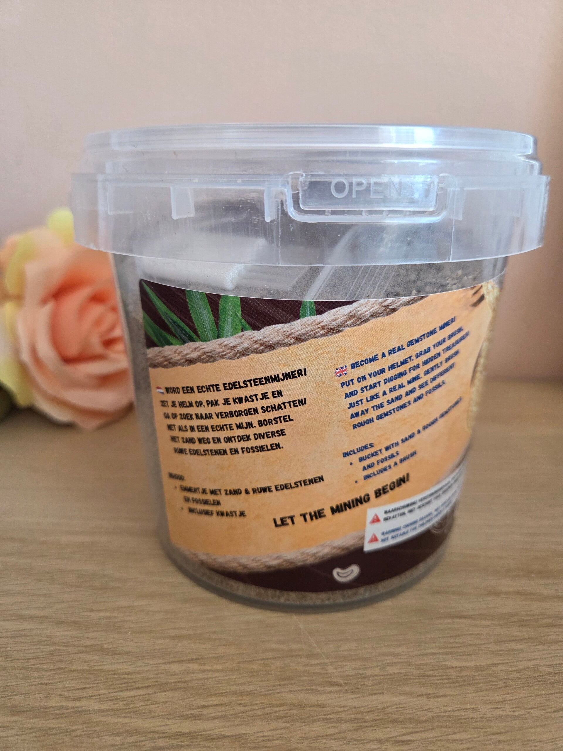 - Emmertje met zand en ruwe edelstenen en fossielen.