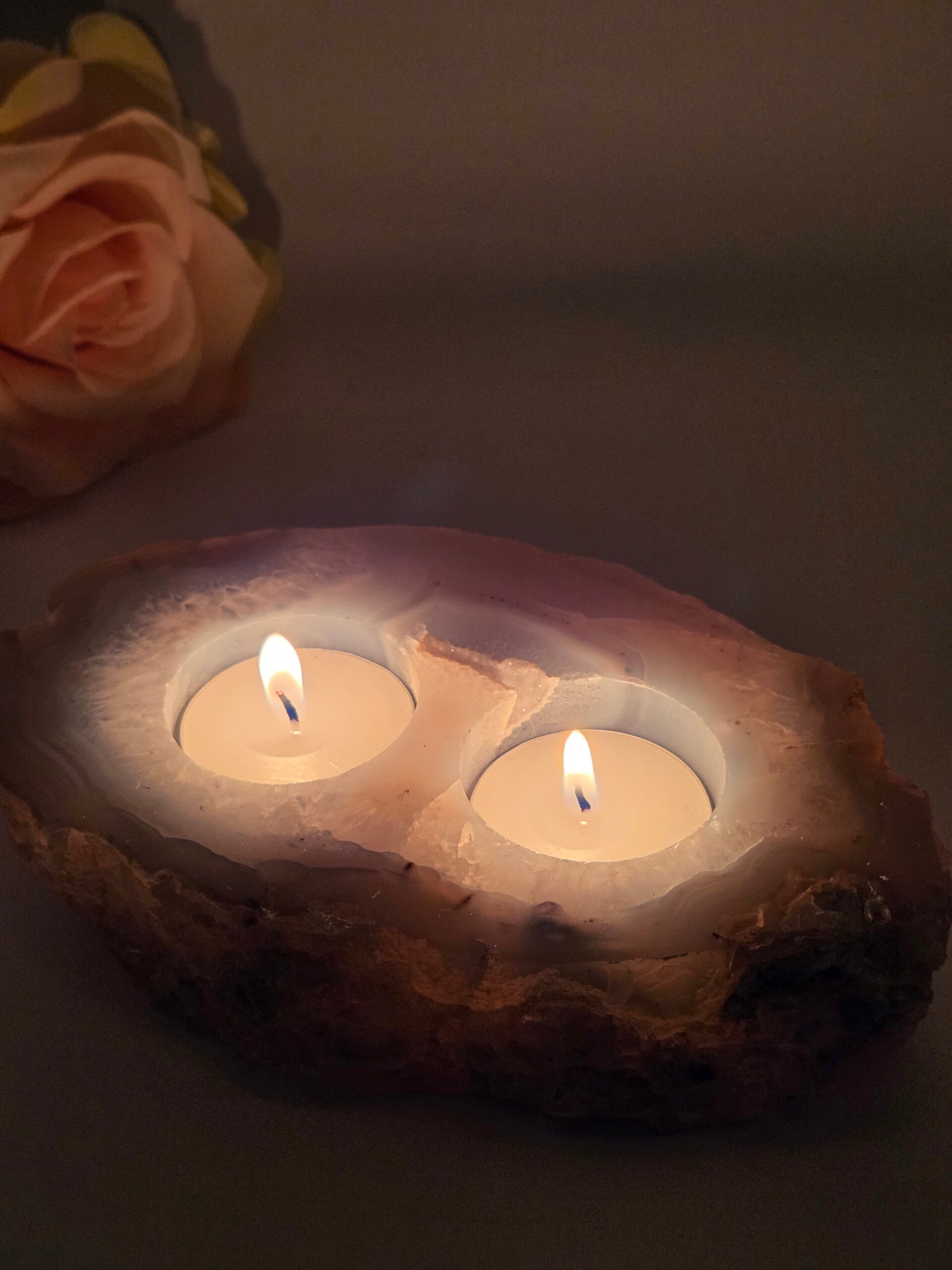 De theelichthouder van Agaatschijf is een uniek woonaccessoire dat sfeer, zachtheid en natuurlijke energie in elke ruimte brengt. Agaat staat bekend om zijn rustige, aardende werking, waardoor deze houder niet alleen prachtig oogt, maar ook een harmonieuze uitstraling creëert. Met ruimte voor twee theelichtjes zorgt deze houder voor een warme, gelijkmatige gloed die perfect is voor een ontspannen avond, een meditatiemoment of als stijlvol decoratiestuk in je interieur.