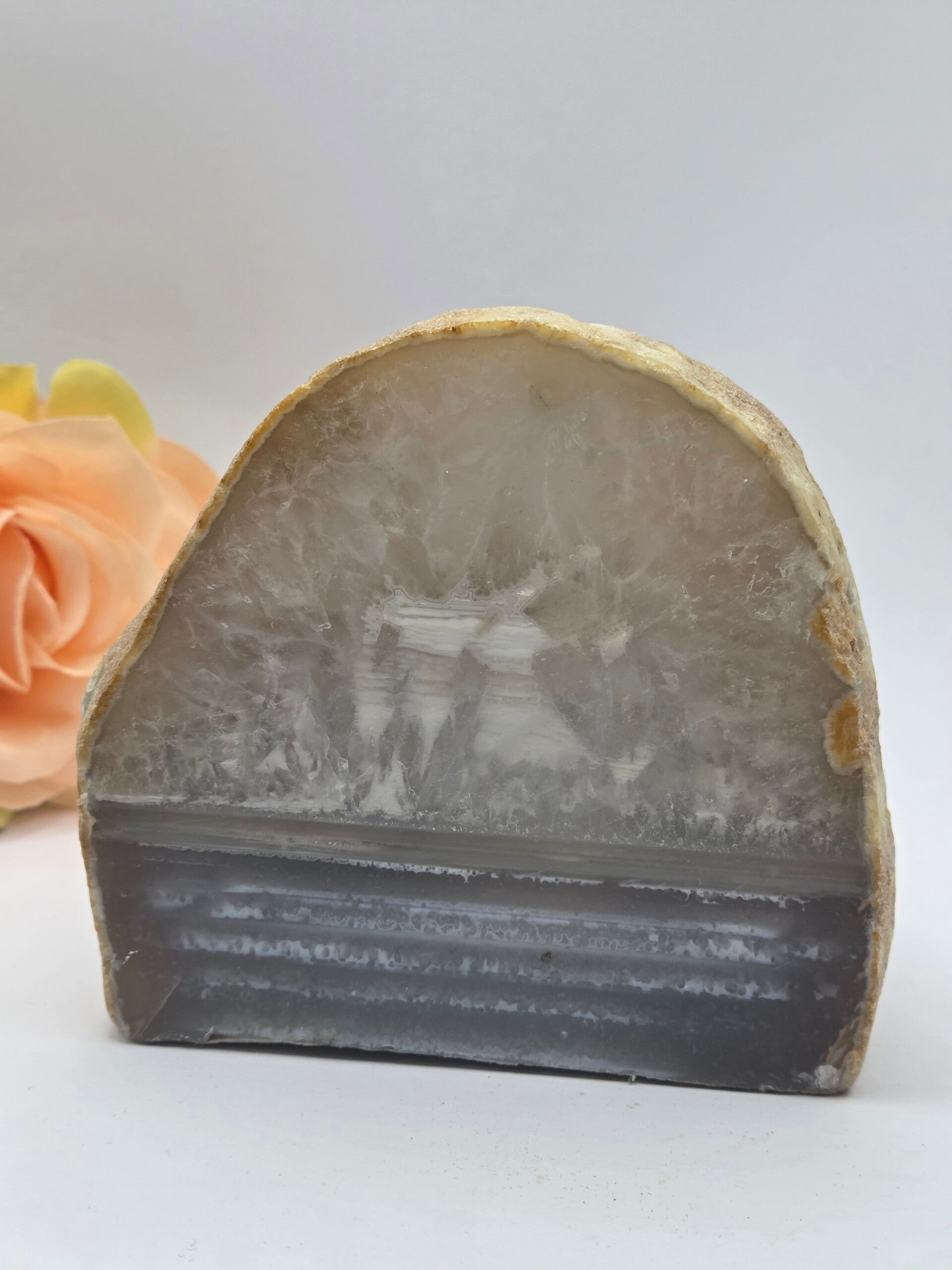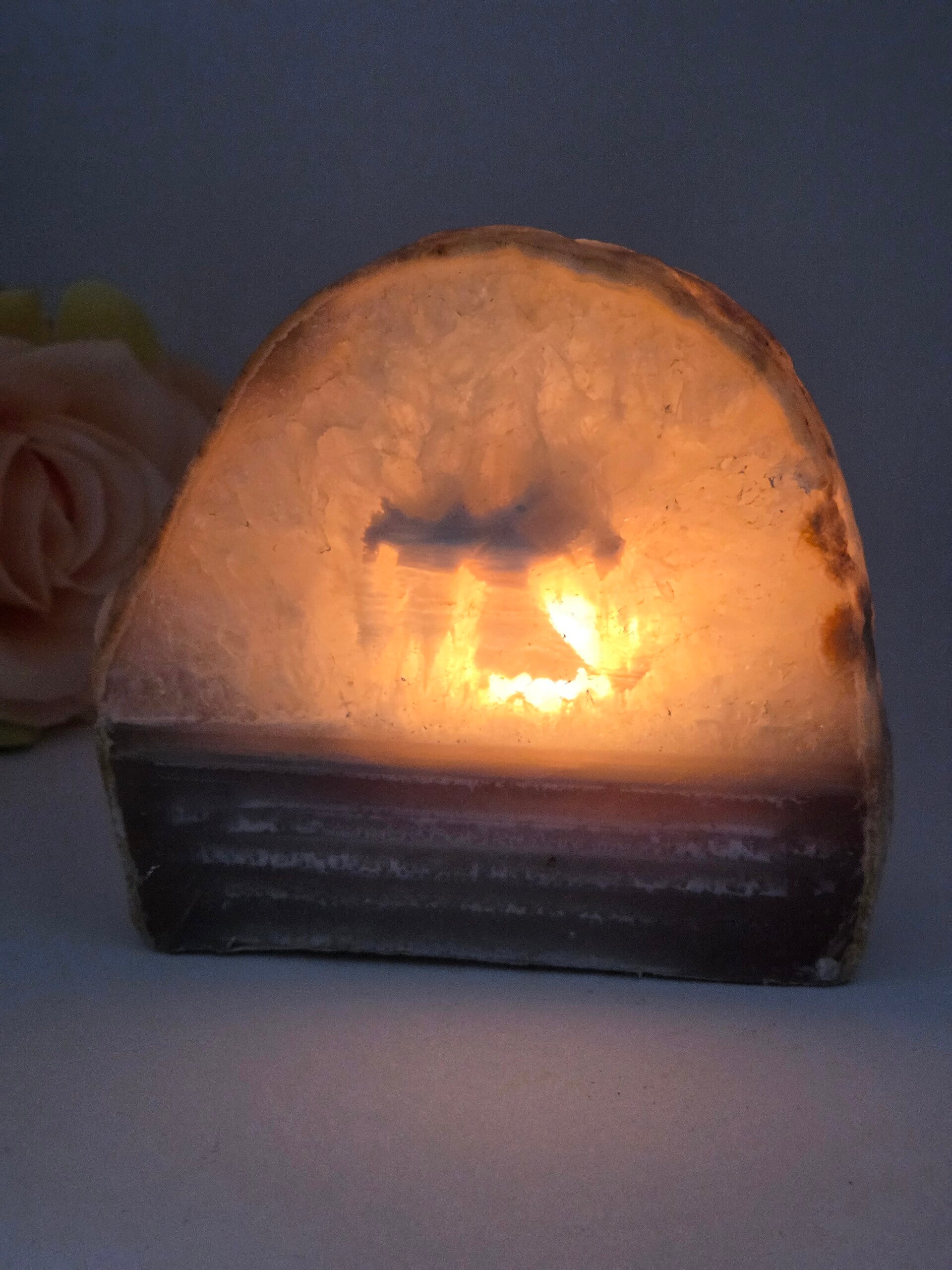 Breng natuurlijke sfeer en rust in huis met deze prachtige Agaat theelichthouder. Elk stuk is uniek, met zijn eigen kristalstructuur en kleurpatroon. Wanneer je een theelichtje aansteekt, schijnt het warme licht subtiel door het edelsteenoppervlak, wat zorgt voor een rustgevende, sfeervolle gloed.