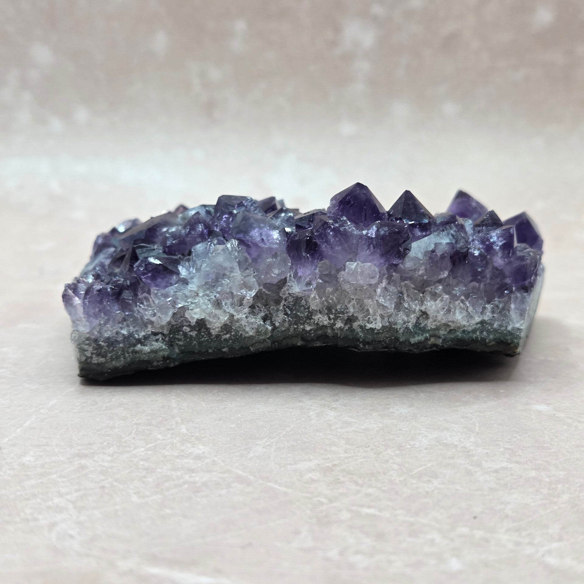Deze prachtige Amethist cluster uit Uruguay is een natuurlijke edelsteen van hoge kwaliteit en staat bekend om zijn diepe paarse kleur en krachtige energie. Met een afmeting van 10 cm x 8 cm x 3 cm en een gewicht van 345 gram is dit Amethist cluster perfect als decoratief stuk én als energetische steen.