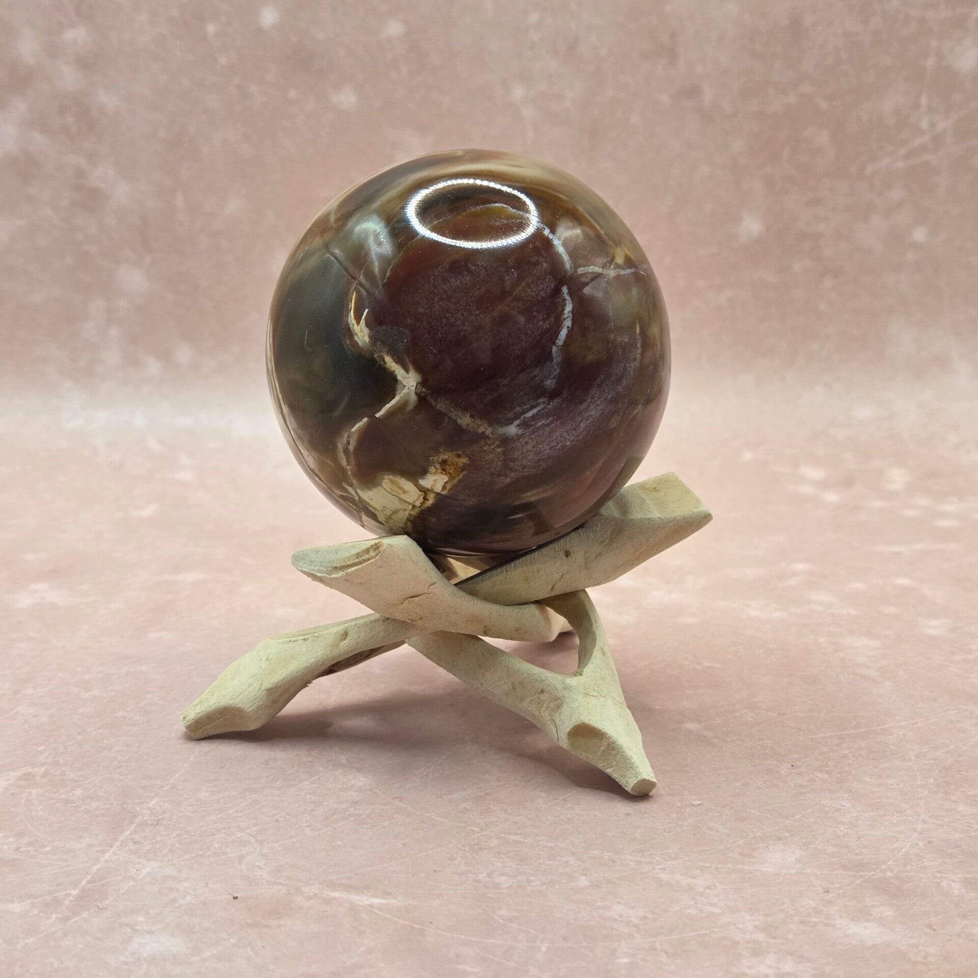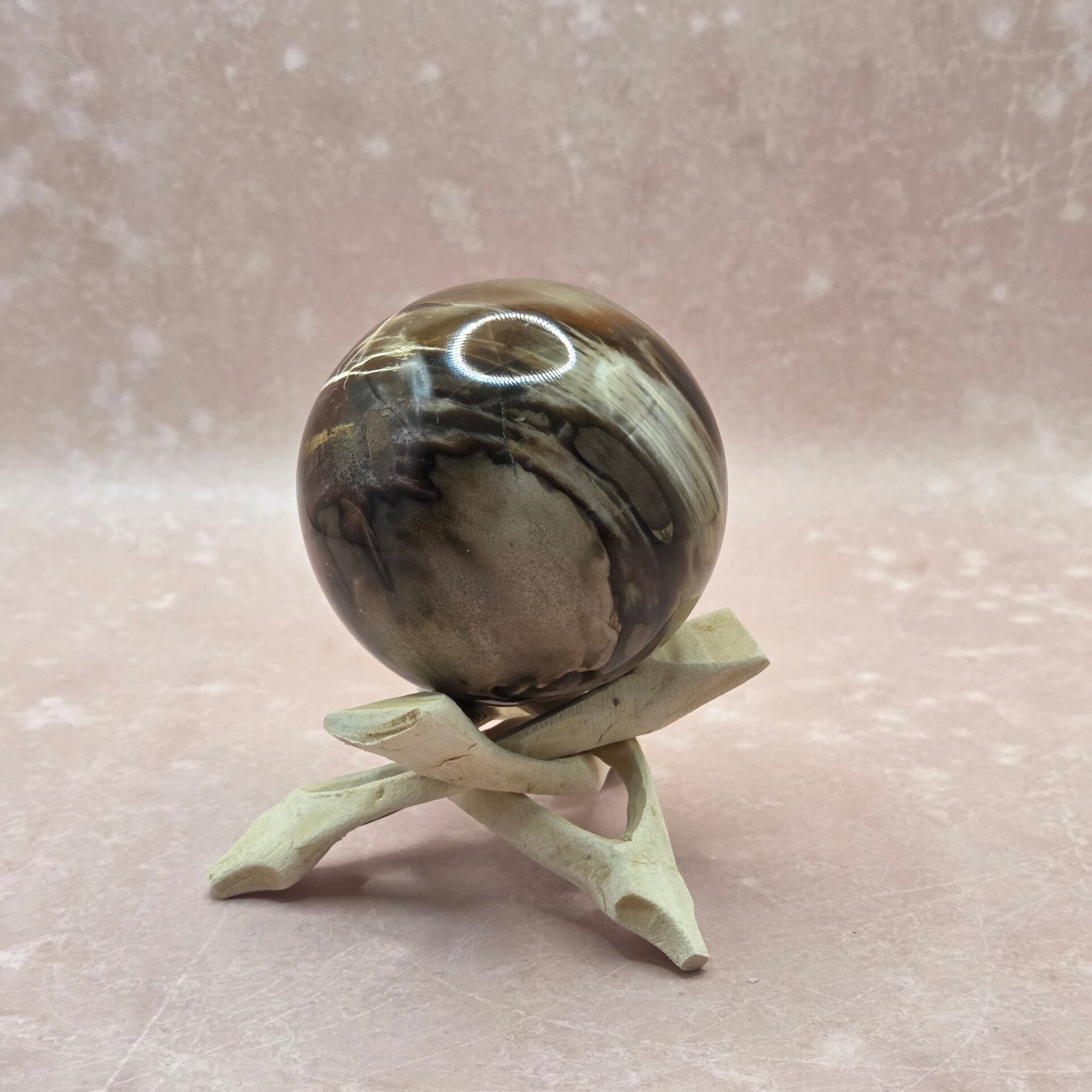 Versteend hout ontstaat wanneer hout over miljoenen jaren volledig wordt gemineraliseerd. De oorspronkelijke houtstructuur blijft zichtbaar, wat elke bol uniek maakt. De warme aardetinten en natuurlijke patronen zorgen voor een tijdloze en robuuste uitstraling.