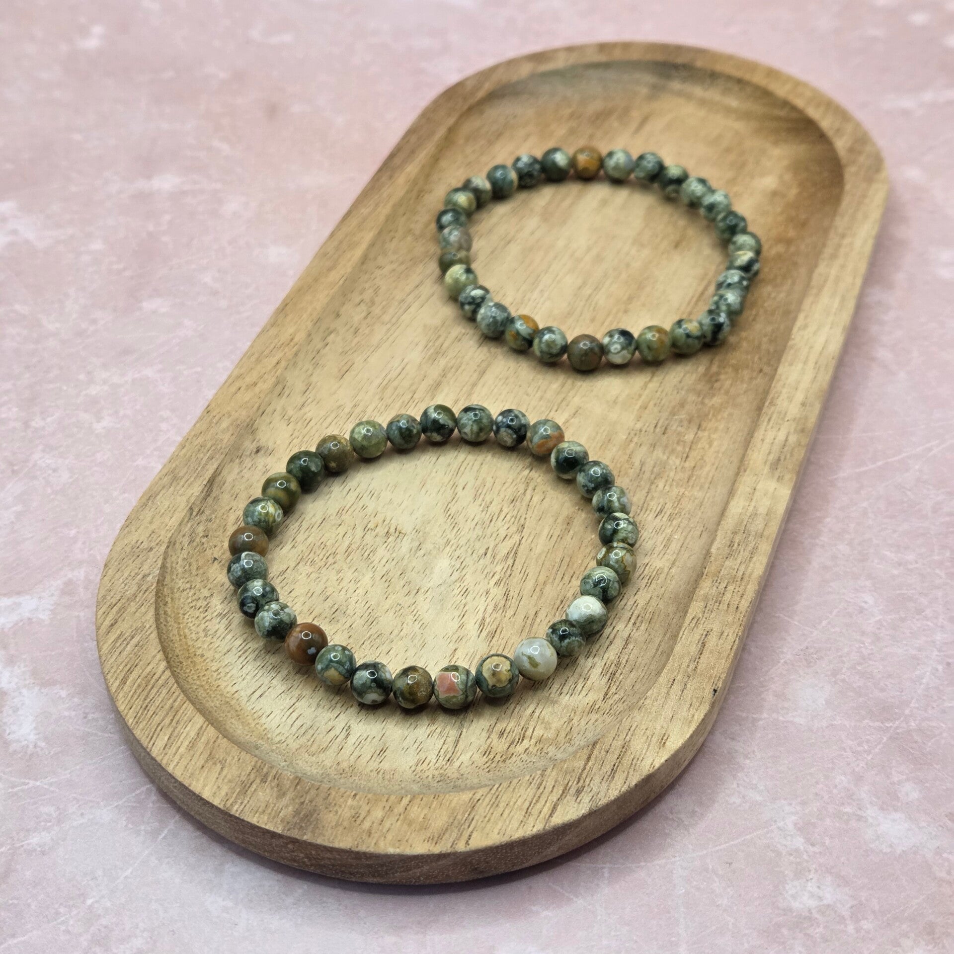 De Rhyoliet armband is een leuke toevoeging aan jouw armbanden collectie. Met hun betoverende aardetinten – groen, bruin, crème en soms subtiel rood – lijken ze rechtstreeks uit een sprookjesbos te komen.