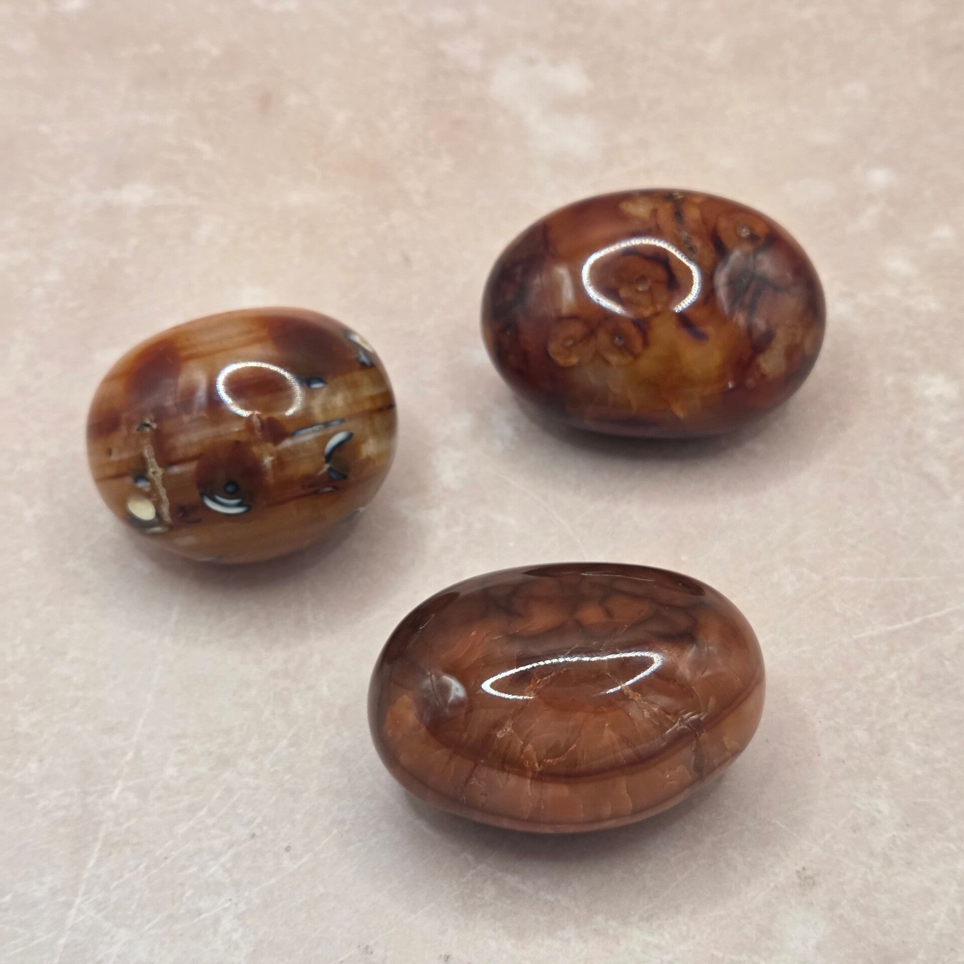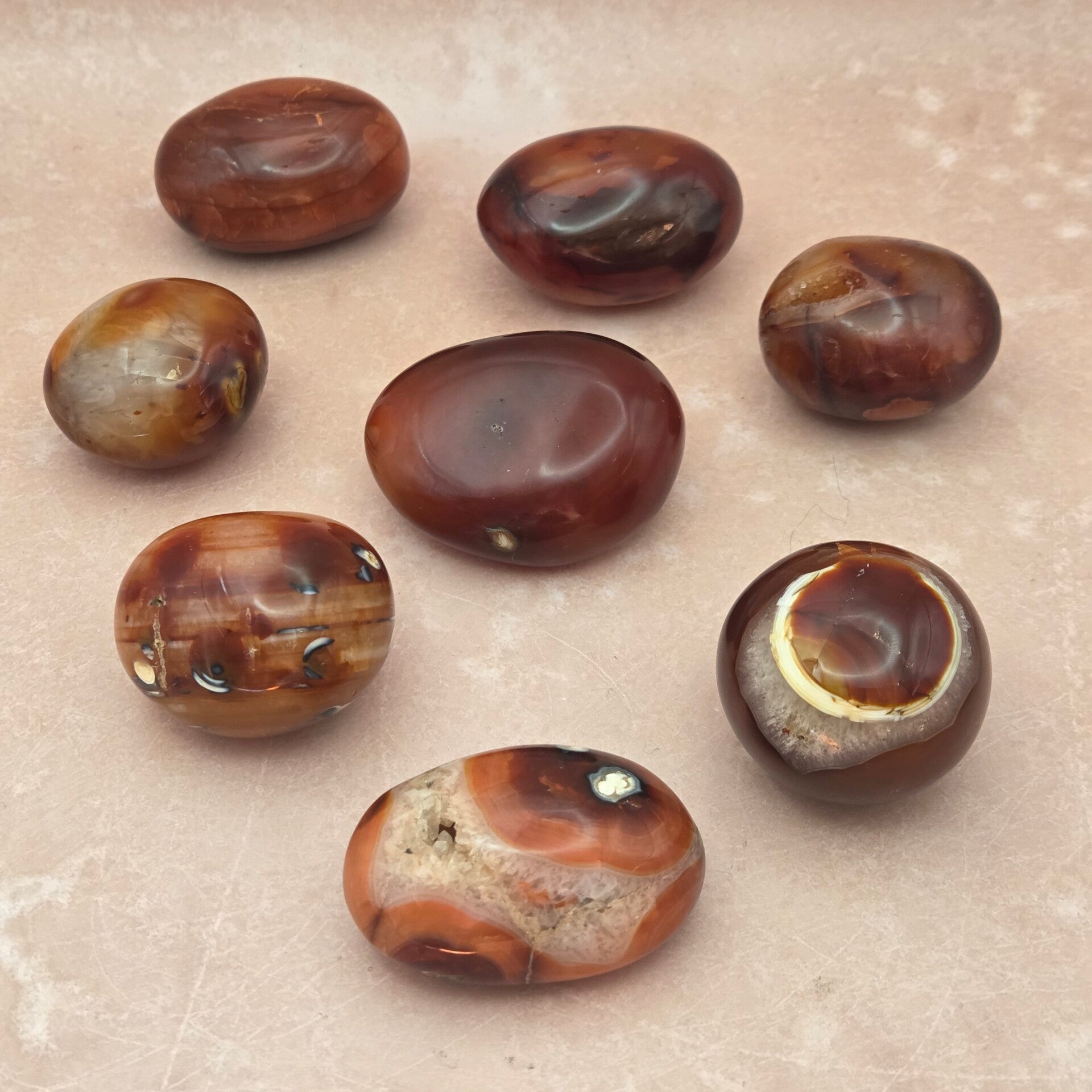 Deze grotere getrommelde Carneool stenen hebben warme tinten van oranje tot diep rood en een mooie natuurlijke glans. Door het trommelproces zijn de stenen glad gepolijst, waardoor de kleuren en patronen goed zichtbaar worden.